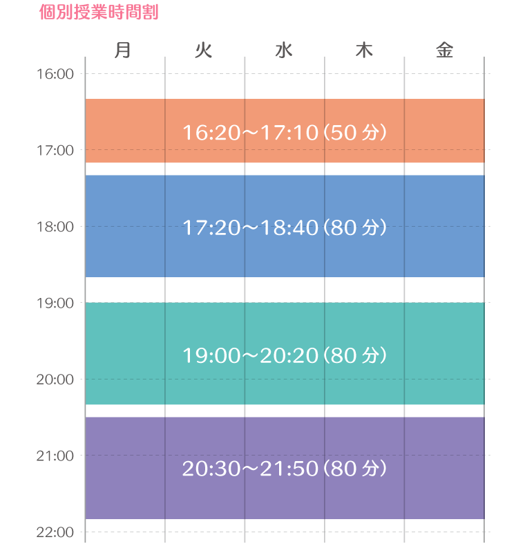 カリキュラムは自由自在。きめられた時間割の中から、受講したい教科や通いたい曜日・時間を選択することができます。部活や習い事で忙しいお子様でも大丈夫です。